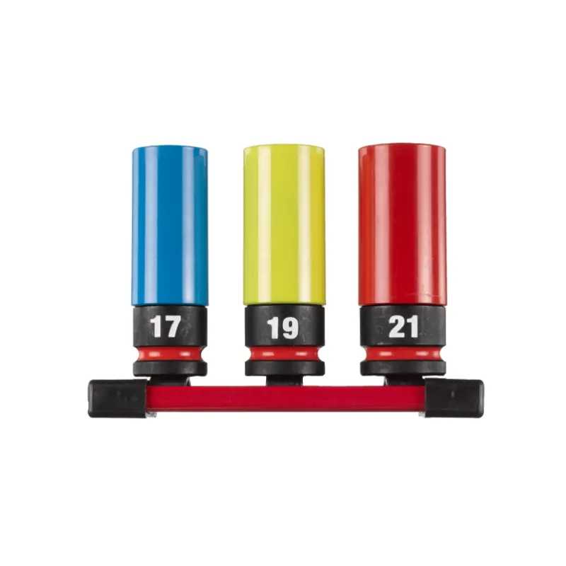 Contenu : Jeu de douilles caoutchoutées 1/2" - 17/19/21 mm, fourni avec un guide magnétique.