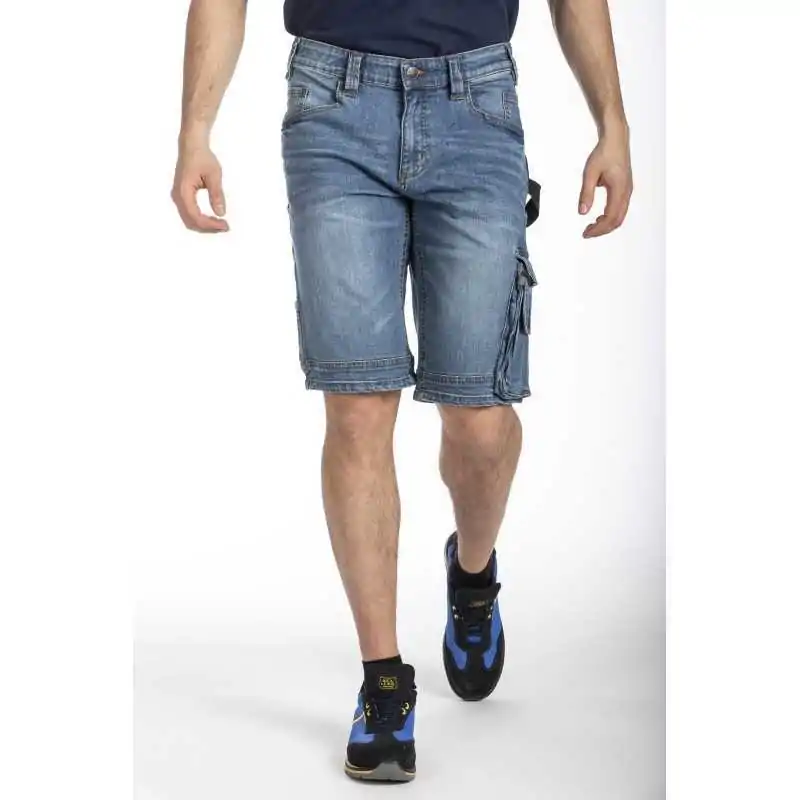 bermuda da lavoro di jeans job multi-tasche stretch fibreflex® con cintura interna elastica antiscivolo. doppia cintura interna con elastico "antiscivolo", patta con cerniera, coscia comfort con tasca per cellulare. gamba interna 33 cm.