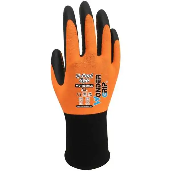 Il Wonder Grip® WG-1855HOS U-Feel Spe è un guanto con un unico rivestimento in nitrile costruito su una fodera in poliestere e spandex calibro 18. La nostra immersione Wonder Grip Performance ™ offre un rivestimento protettivo sottile e liscio eccezionale, offrendo livelli incomparabili di sensibilità e destrezza a portata di mano. Incredibilmente sottile e morbido, offre agli utenti una sensazione di seconda pelle, fornendo un eccezionale livello di comfort e precisione, guanto ideale per compiti di precisione. Ora disponibile con esclusivi micro punti sul palmo per proprietà di resistenza antiusura migliorate e prestazioni di presa